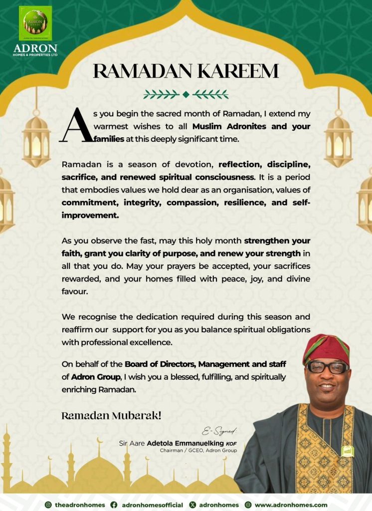 As the crescent ushers in the sacred month of Ramadan, Adron Homes & Properties Limited has extended warm felicitations to Muslim faithful across Nigeria, urging them to embrace the profound virtues of sacrifice, discipline, compassion, and unwavering faith that define the holy season.